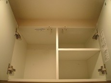 ウォシュレット付きトイレです。頭上には吊戸棚があり、3つに分かれているスペースがあります。