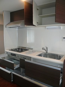 落ち着いた雰囲気のキッチンです。収納もしっかりあり、足元からある引き出し収納は整理整頓がしやすく出し入れも便利そうです。調理スペースも十分にあり使い勝手が良さそうです。