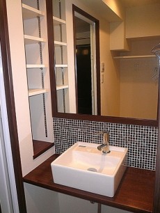 コンパクトでオシャレで可愛らしい洗面台です。鏡もみやすく、左側には収納棚があります。
