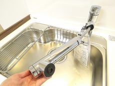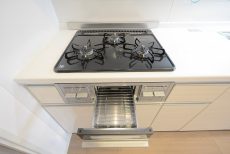 3口のグリル付きガスコンロ、浄水機能付きの水栓はシャワーヘッドになっています。