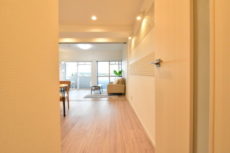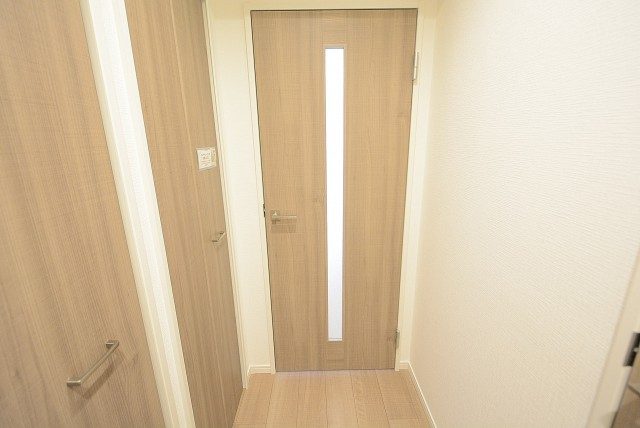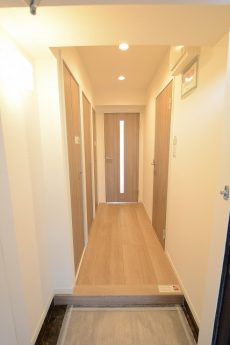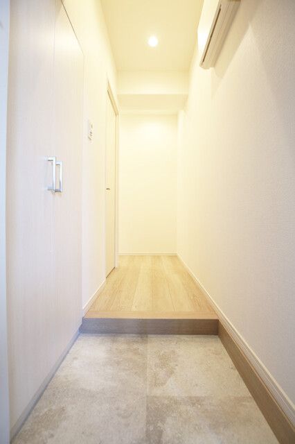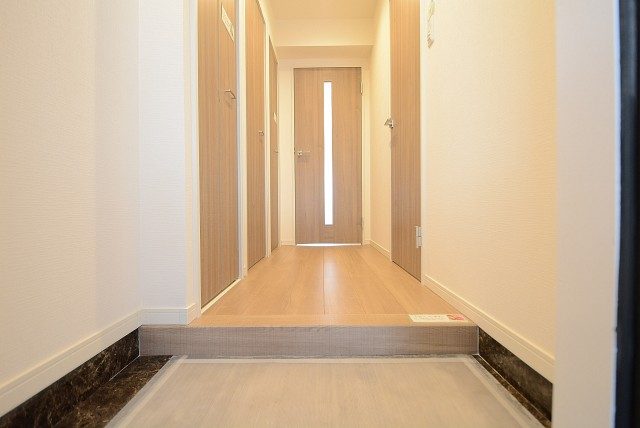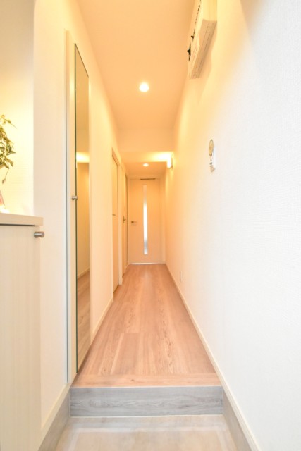 廊下は左に折れていて戸口から室内が見えないような造り。宅配便やフードデリバリーなど知らない人が訪ねて来ることも多い昨今、これならプライバシー的に安心ですね。玄関外にはモニター付きインターホンも設置されているので、事前に映像で確認することも可能です。