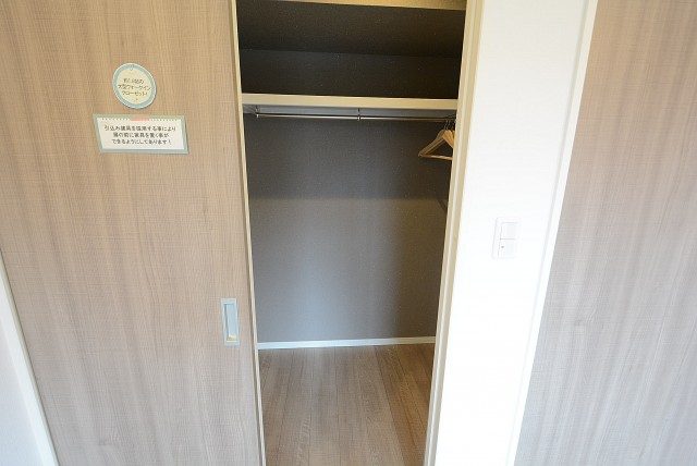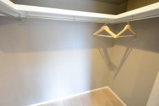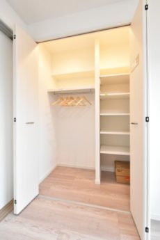 収納はクローゼット。ハンガーポールと棚が設置されたシステム収納タイプです。奥行きも深いので収納力も抜群ですよ。