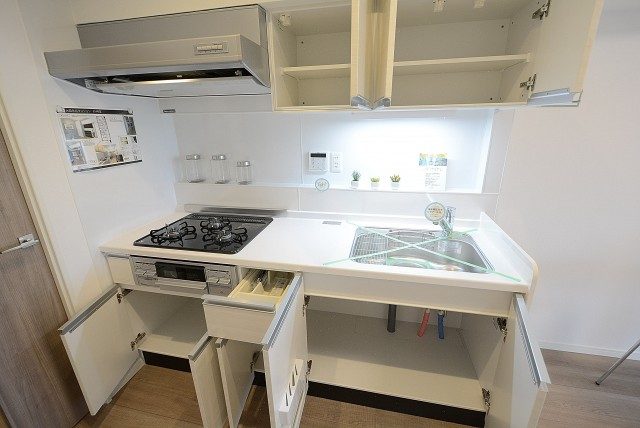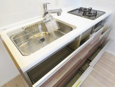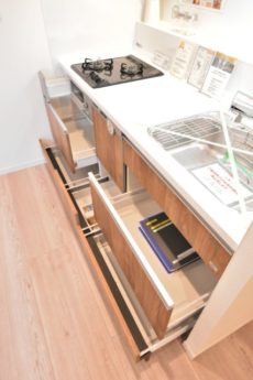 収納は調理台下と吊戸棚。引き出しタイプのスライドキャビネットは出し入れがし易く、たくさん詰めても中身の確認がしやすいのが特徴です。