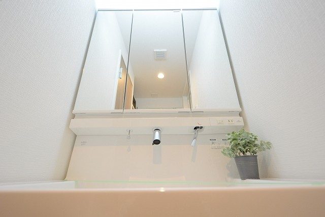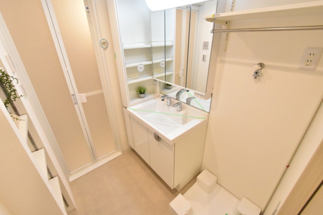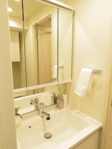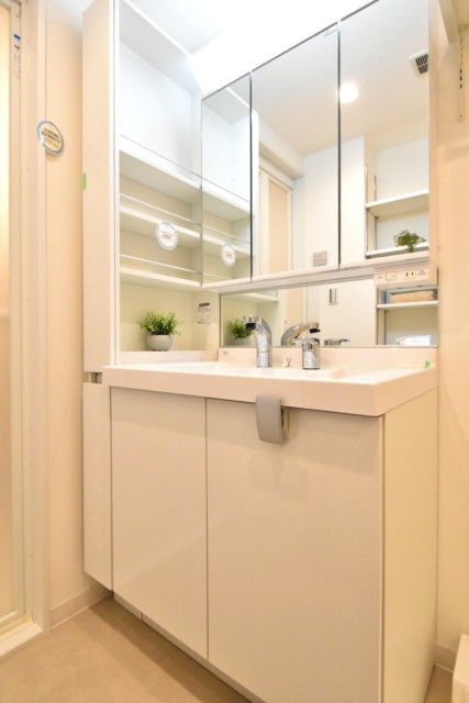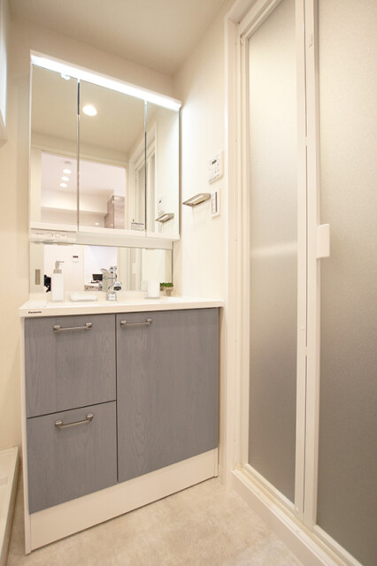 洗面室には洗面化粧台、洗濯機スペース、浴室がまとまっていて脱衣所を兼ねています。洗面化粧台は身だしなみを整えるのに便利な三面鏡付き。ミラーキャビネットなど収納も豊富で、洗面周りの細々としたものもすっきり収まります。洗濯機スペースには吊戸棚も付いているので洗剤などはこちらへどうぞ。
