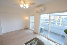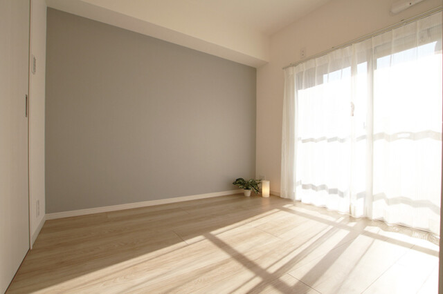 本来の約6帖の洋室に戻ります。南西向きのバルコニーに面した大きな窓があり、とても明るいお部屋ですね。