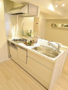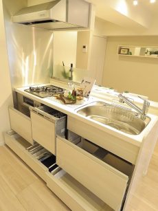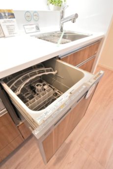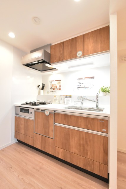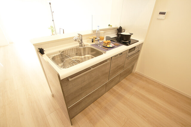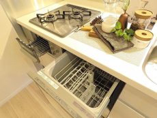 キッチンは人気のカウンタータイプ。リビングダイニングとコミュニケーションがとりやすく、お料理中でもご家族やご友人との会話が弾むキッチンです。コンロ前に設置された油跳ね防止の衝立も、透明なガラス製なので解放感を損なうことはありません。食器洗浄乾燥機や浄水機能一体型水栓など便利機能も充実しています。
