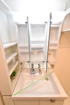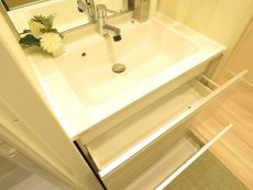 洗面化粧台は鏡の裏、引き出しと収納スペースが豊富。