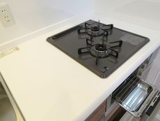 コンロは2口、グリル付き。調理中は換気扇をお忘れなく!窓を開け、少し前から回し始めると効果的らしいですよ。