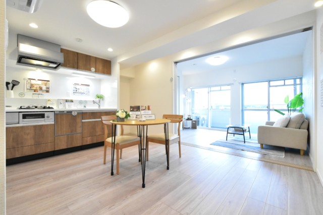 こちらは約8.6帖のリビング・ダイニング・キッチン+約6帖の洋室。仕切り戸を開けて二部屋をつなげた様子です。ご家族構成によっては、こんな感じに広いLDKとして使うのもありですね。LDKには窓がありませんので、広さだけでなく明るさもアップしますよ。
