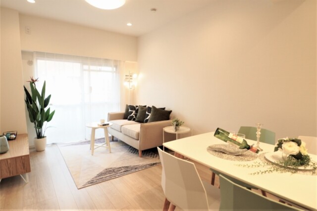 家具は付いてきませんが、飾ってあることによって生活のイメージが付きやすくて助かります。大きさや色、素材感などいろいろ参考にさせてもらいましょう!LDKにも収納棚が付いていて、散らかり勝ちなリビングを片付けるのに便利です。