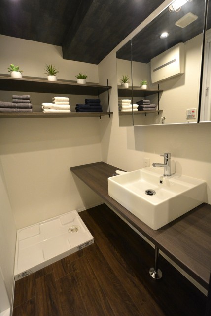 洗面室は洗濯機置き場、洗面化粧台、バスルームがまとまっています。