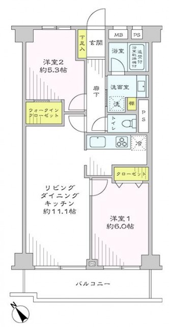 LDKは約11.1帖、南西向き。長方形の空間は家具の配置もしやすそうです。