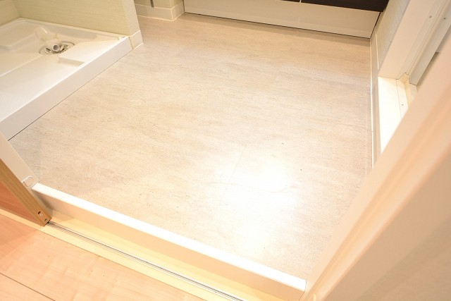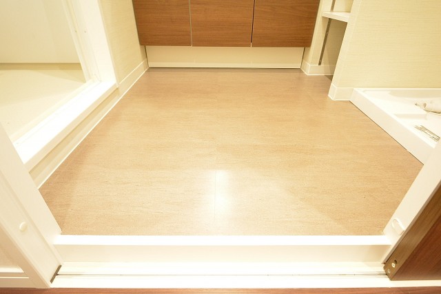 扉をあけると右側に洗濯機置き場、正面に洗面化粧台、左側にバスルームの並びになっています。