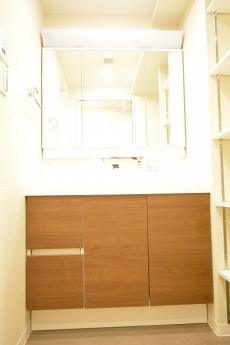 洗面化粧台は3面鏡の裏が収納になっており、ゴチャゴチャ散らかりがちなハブラシやコスメもスッキリまとめてしまっておけそうです。