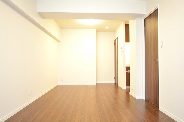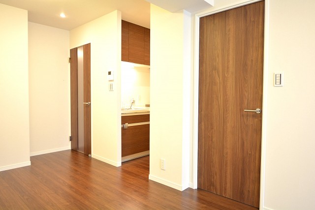 右側に洗面室とトイレ、左側に洋室とLDKの扉が並んでいます。