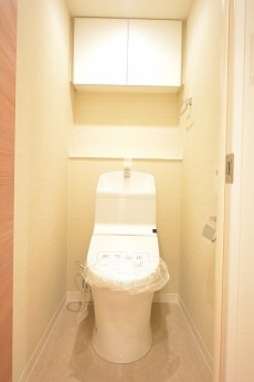 後ろには芳香剤などを置くのによさそうなカウンターと扉付きの吊戸棚が設置されています。