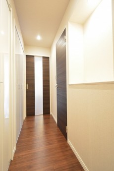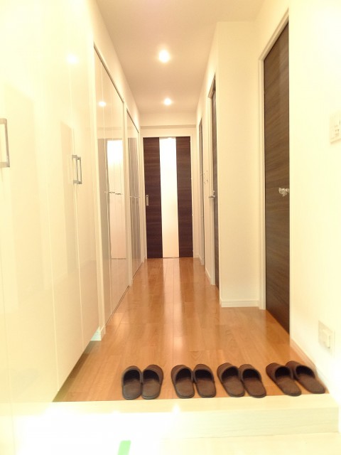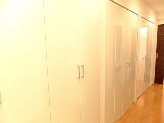先ず目に飛び込んでくるのは廊下いっぱいの収納棚~~~~~☆
