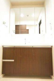 洗面室には洗面化粧台の他に洗濯機スペースと浴室がまとまっていて脱衣室も兼ねています。洗面化粧台は身だしなみを整えるのに便利な三面鏡付き。裏がキャビネットになっているので、洗面周りに散らかりがちな細々したものもスッキリと片付けることができますよ。浴室方面が気になって仕方ありませんが・・・笑