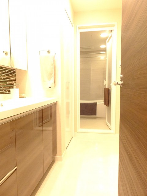 正面に洗面台、右側にバスルーム、左側にランドリースペースの配置になっています。