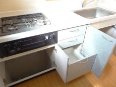 収納場所も上下にしっかりあります。調理スペースが少し狭いものの、コンロは3口。手際よくお料理が進められそうです。