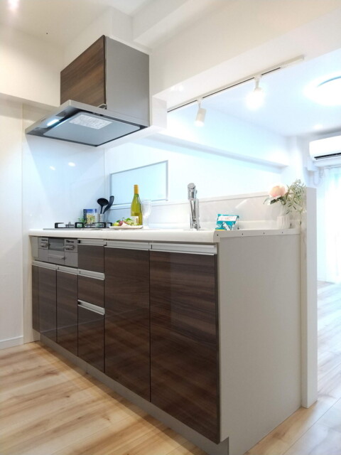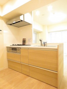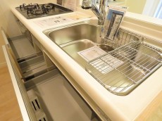 キッチンはフローリングに馴染む木目柄。水道に浄水機能付き、コンロは3口、トップはしっとりとした質感が魅力の人造大理石が使われています。大割りのスライド収納も物の出し入れがしやすく使い勝手がよさそうです。
