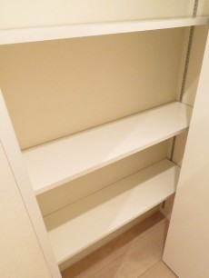 洋室の斜め向かいは棚のついた収納。日用品のストックなどを入れておくのによさそうです。
