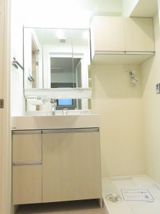 洗面室。洗面化粧台、洗濯機置場、バスルームがまとまっています。