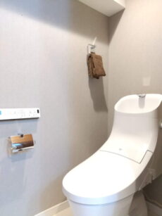 収納のお隣はトイレ。ウォシュレットと収納棚付き。