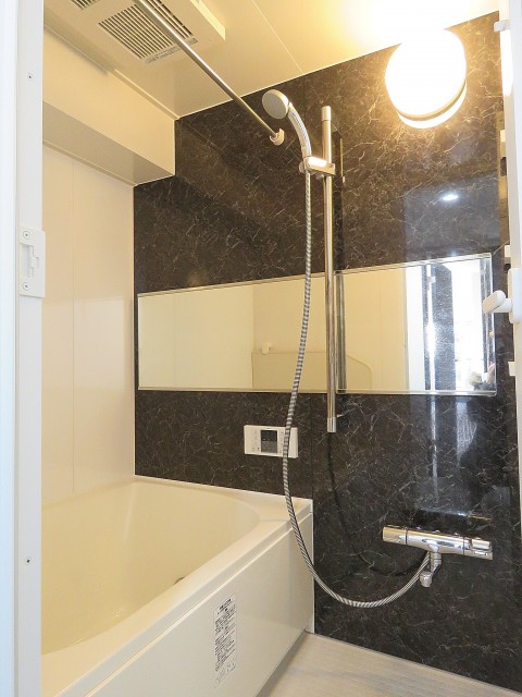 バスルームもお部屋の雰囲気と同じく壁パネルは木目調です。