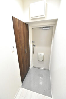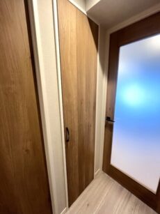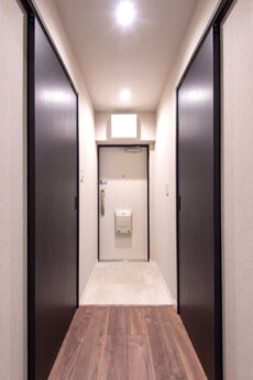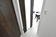 玄関から真っすぐに伸びた廊下は、濃いめの建具と白のクロスのコントラストでシャープな印象。居室へのドアは横向きで戸口から室内が見えづらくなっています。宅配やフードデリバリーなどで知らない人が玄関口に来ることも多くなりましたからね。(ちなみに正面のドアはトイレです)