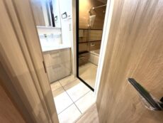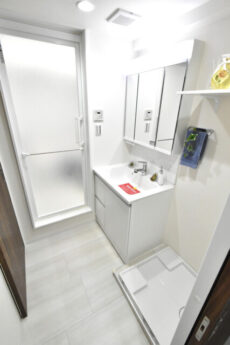 洗面室には洗面化粧台、浴室、洗濯機スペースがまとまっています。脱衣所も兼ねているのでこれくらいのスペースがあるのは嬉しいですよね。洗面化粧台は三面鏡付き。裏はキャビネットになっているので、細かい物もすっきり収納出来ますよ。洗濯洗剤などの洗濯グッズは洗濯機スペース上の吊戸棚にどうぞ。