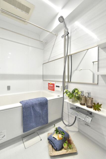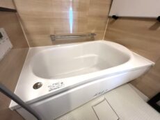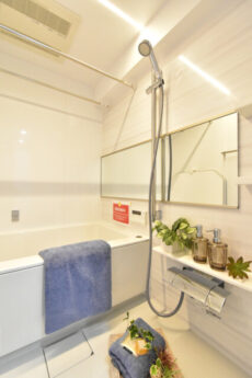 浴室は、お部屋同じ白とダークブラウンでまとめられたモダンな雰囲気。TOTO製のユニットバスには追い焚き機能や浴室換気乾燥機など便利機能を完備しています。これからの寒い季節、ヒートショック予防のためにも「暖房」で浴室を暖めてから入りましょう。