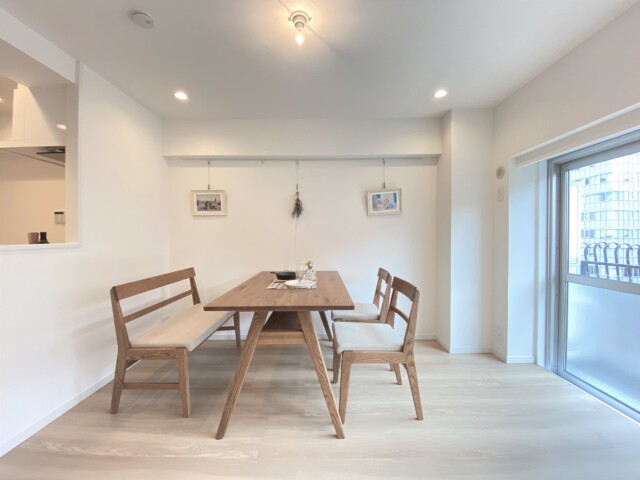 東向きの窓が付いています。と言っても、隣の洋室との仕切り戸は素通し。南向きバルコニーに面した大きな窓からの光も射す、明るいお部屋になっています。10帖だとダイニングテーブルを置いて、ソファーを置いてというのはちょっと難しいかと・・・奥の洋室とつなげてLDKとして使うか、寛げるような大きめのダイニングセットにするか、リビングで食事をするか、ご自身の生活スタイルに合わせてチョイスしていきましょう。