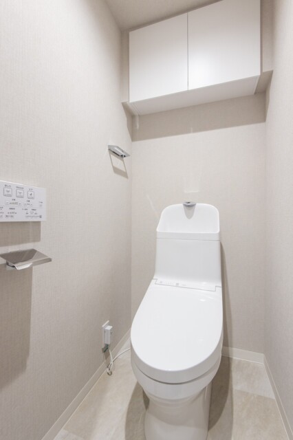 トイレは洗浄便座付き。TOTO製のウォシュレットです。吊戸棚はトイレットペーパーなどのストックにとても便利。
