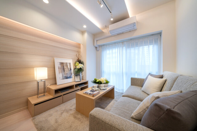 リビング部分は、南西向きのバルコニーに面した窓からの光で明るく居心地よさそう。昔のブラウン管テレビの時代だったら幅が狭かったかもしれませんが、薄型テレビの登場でだいぶ感覚も変わりましたね。