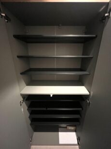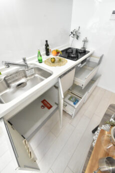 収納はスライドキャビネット。出し入れが楽で奥の方まで何が入っているかの確認がしやすいのが特徴です。キッチン横には大きな物入れがありますので、食品ストックなどはこちらに入れるのも良さそうですね。