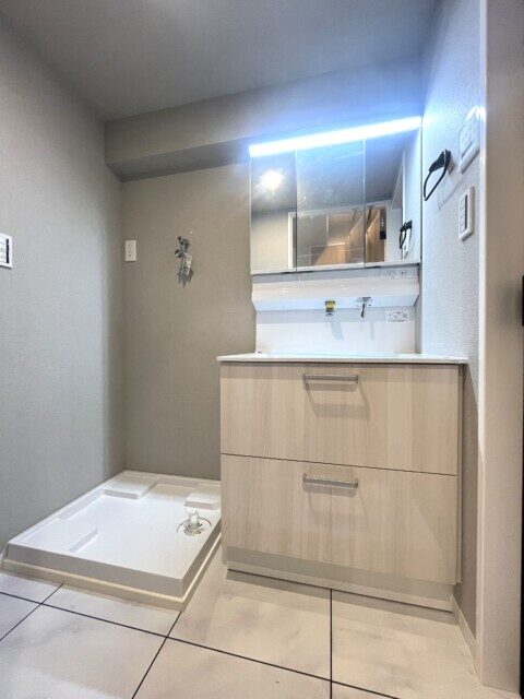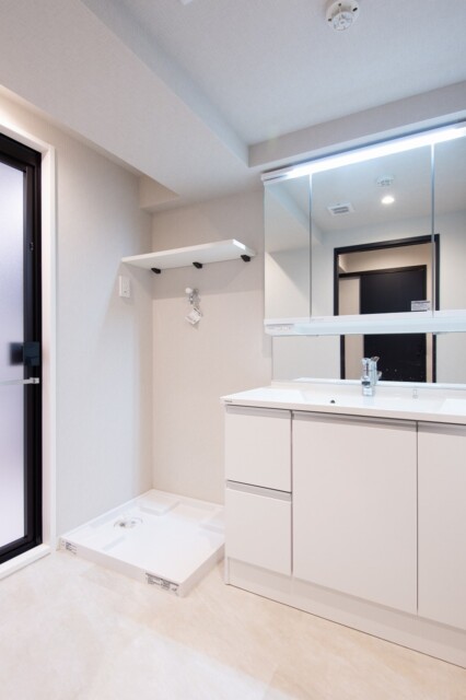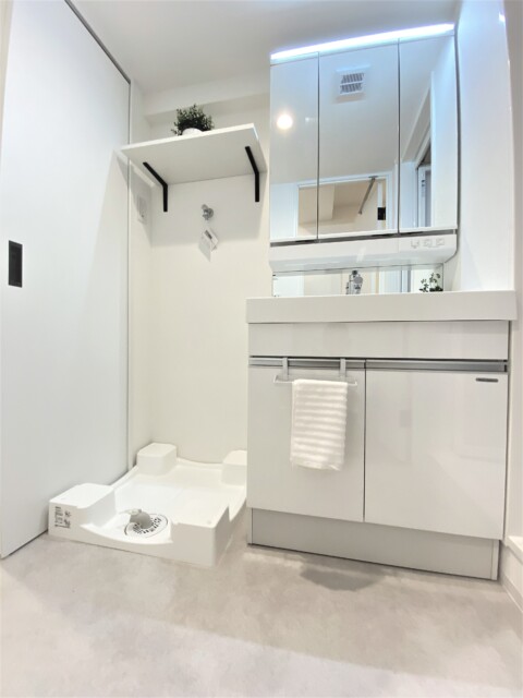 洗面台は三面鏡付。上部に付いた照明のおかげで影にならずに使えます。裏はキャビネットになっていますので、洗面周りの細々したものもすっきり片付けられますよ。洗濯機スペースの棚には洗剤などのお洗濯グッズをどうぞ。