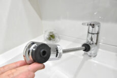 水栓はヘッドが伸びるハンドシャワータイプ。洗面ボウルを流したりに便利です。ミラーキャビネットや洗面台下には豊富な収納。様々なタイプがあって、細々としたものも上手いこと納まりそうです。