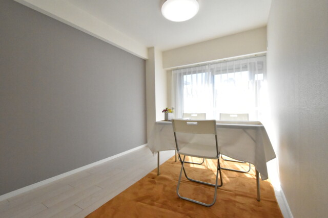 LDKと同じ、南西向きバルコニーに面したお部屋です。やはり陽当たりは良好ですね。室内は色数抑えめ、アクセントクロスもグレー系なので家具も合わせやすそうです。(テーブルとイスは打ち合わせ用です)