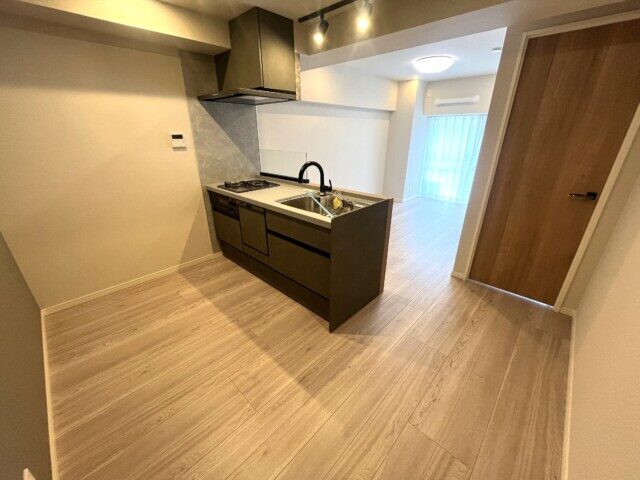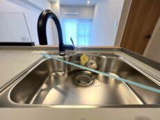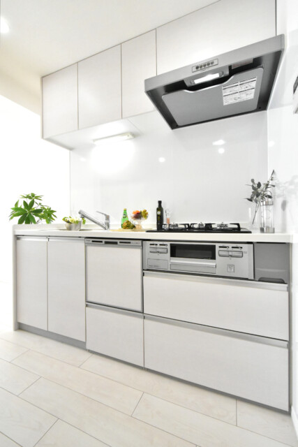 キッチンは壁付けタイプ。カウンターキッチンなどに比べて場所をとらず、お部屋を広く使えるキッチンです。デメリットとしてキッチン内が丸見えで生活感が出やすいので、普段から整理清掃を心がけましょう。