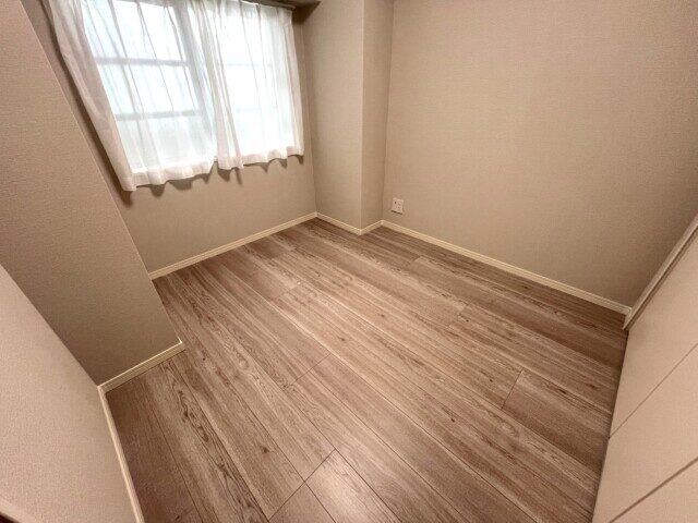 こちらは約4.8帖の洋室。北東向きの窓があるお部屋です。大きなウォークインクローゼットが付いているので外には収納家具を置く必要がありません。4.8帖と広いわけではありませんが、大きめのサイズのベッドや、シングル2台もOKです。