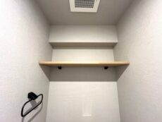 トイレットペーパーなどが置いておける棚が付いています。ストックがトイレ内にあるのは心強いですよね笑。もちろん洗浄便座付き。TOTO製のウォシュレットです。