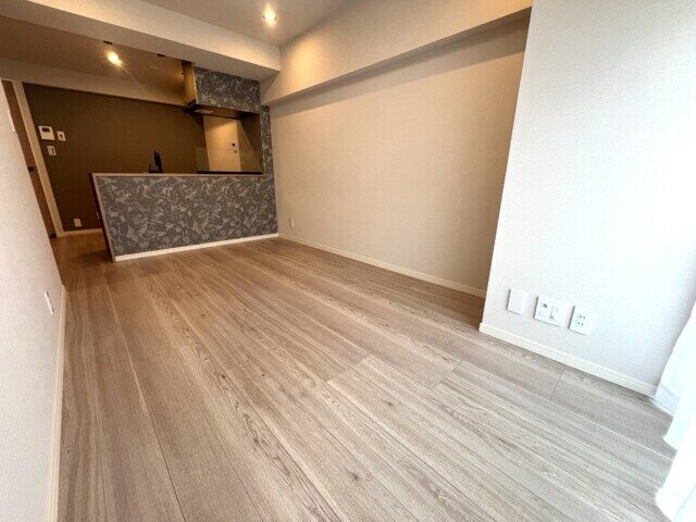 奥のバルコニーに向かって細くなった形のお部屋です。手前をダイニングキッチン、奥をリビングとして使うイメージのようですね。ダイニングが暗く見えますが、奥が明る過ぎるのと、まだダイニングのシーリングに照明が付いていないだけなのでご安心ください。