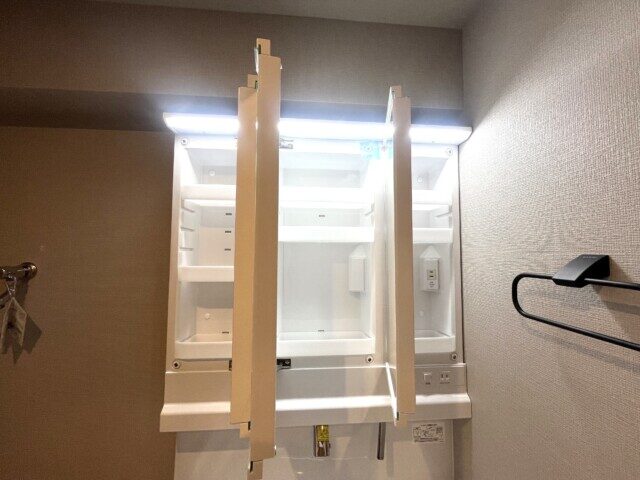 洗面化粧台は身だしなみを整えるのに便利な三面鏡付き。裏がキャビネットになっているので、洗面周りに散らかりがちな細々したものもスッキリと片付けることができますよ。