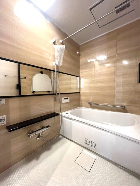 浴室は木目パネルに囲まれた落ち着いた雰囲気。リラックスしたバスタイムで一日の疲れも洗い流せそうですね。追い焚き機能や浴室換気乾燥機などの便利機能も完備していています。