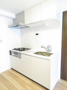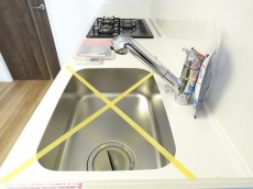 3口コンロ、浄水機能付き水栓、上下に収納たっぷりと設備も◎。