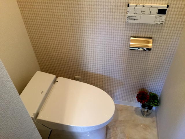 トイレは嬉しいウォシュレット付になります。チェック柄のクロスで可愛い印象♫