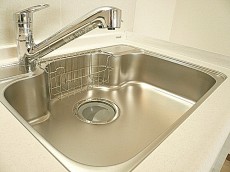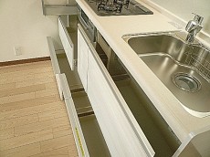 システムキッチンです。上下にはしっかりと収納が設置されています。下部にあるスライド式収納は奥までみやすく仕舞いやすい使い勝手の良い収納ですね。シンクも広々~大きなお鍋も洗いにくいまな板もガシガシ洗えそうです!