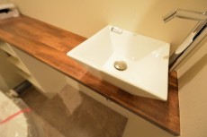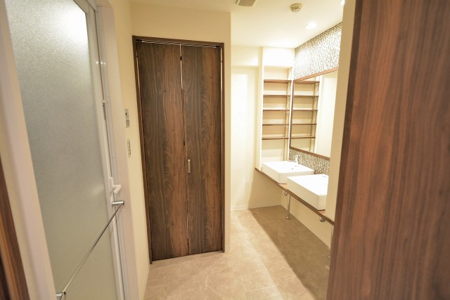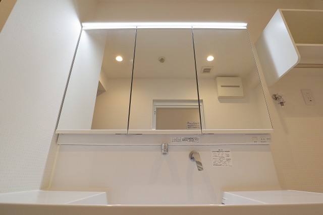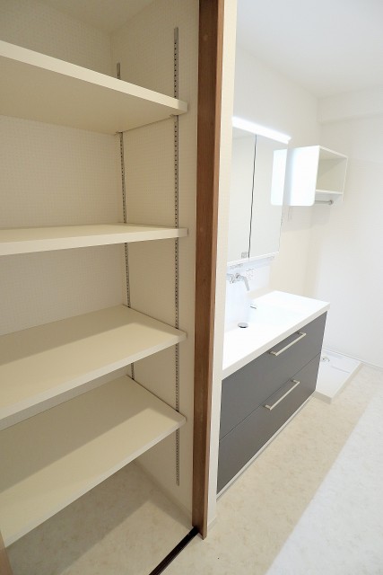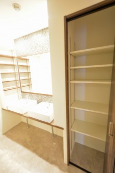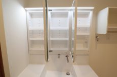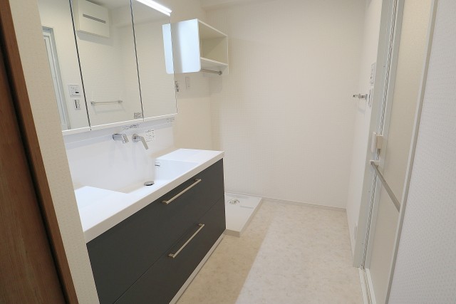 入って右側が洗面スペースです。大きな鏡に洗面台だ2台付いていますので、朝の忙しい時間も先を争わずに使っていただけそうですね(*^。^*)