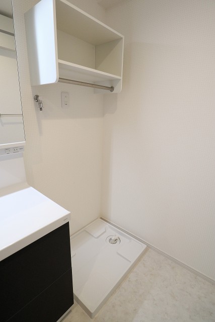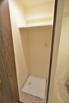 サニタリールームに入って正面が洗濯機置場でした。上部に棚もあるので、ここにも収納できちゃいます☆☆
